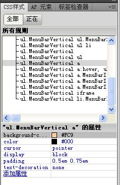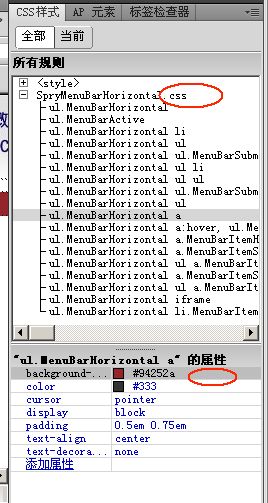 展开CSS面板,点击“全部”,展开CSS面板中下面的第二个,如下图,点击最后一个代码是“a”的,下图中的灰色条,在下一栏“ul.MenuBarHorizxontal a的属性”下面,上面一行“background-”指菜单的背景色,把需要的代码复制即可。也可在这设置鼠标移去时菜单文字的颜色。