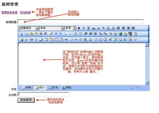 点击右边的“添加新闻”,弹出如下图,在“新闻标题”后输入标题,具体根据下面图中的提示操作。