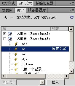 插入一个二行二列的表格,在右边的“绑定”下点击刚设置的记录集(上图是记录集1)那么也点击记录集1,把“bt”拖放到第二行中如下图: