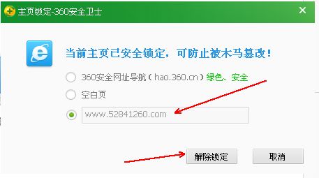 弹出如下对话框:在下面的对话框点击“解除锁定”,再在输入框中中输入如“www.52841260.com”输入网址后如下图中的“解除锁定”,会改变为“安全锁定”,点击