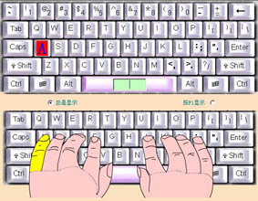 从上面的图中我们可以看出,设计合理的学习界面,我们就按照学习界面提示的方法操作,下一个键盘只有四排,即是提示我们在操作使用中,我们的手指应该如何摆放,不管你用什么软件学习打字,都要按照这个方法—指法必须正确,如果没有正确的指法操作,哪怕您学会了打字,那么您的打字速度肯定很慢,而且错别字多,所以我们必须按照这个方法的规定去学,刚刚开始时是慢,但以后就好了。在学习界面中按照上一排的键盘提示操作,这时上一排的键盘上显示的一个红色的“A”按钮,当我们把左手的小指按“A”,上一排的键盘就显示为“X”,而且下一排的手指在动,它一直是以一个动画的形式在提示您应该如何操作,红色按钮的英文大写字母,是提示下一个应该打的字母,黄色的手指在动,提示您应该用哪一个手指,应按哪一个键,就这样不断循环,一直学到熟悉了哪一个字母在键盘上的哪一个位置,应该用哪一个手指去打,把键盘上的字母全部学会了,才进入下一课的学习。