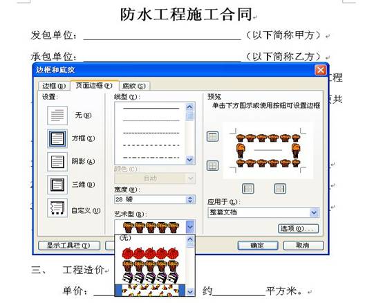 在上面的图中可以看到左边是可以选择边框的样式,在“底纹”的下边可以选择“线型”,再下面可以选择宽度,宽度以“磅”表示,在“艺术型(R)”的下拉列表中有很多的样式,选择了样式后右边的“预览”下显示边框的预览样式。在“应用于(L)”下面的下拉箭头中有多种选择方式,点击确定“按钮”,边框样式就插入了。