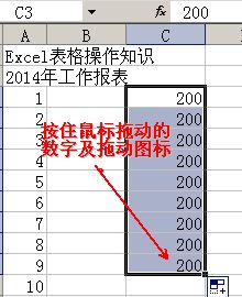 当我们在这个表格中输入数字时,有时它的数据完全相同,比如200,这个数字在一排中全部是200,如果您要一个一个的输入,就显得耗时费力,因为它不是Word只能逐个输入或者复制粘贴,只有您在表格中输入一个“200”,把鼠标移动到“200”表格内的右下角的地方,鼠标的图标由空心的十字变成实心的十字后按住鼠标左键向右或向下拖动,一边拖动一边看,到需要的一格为止,如下图所示: