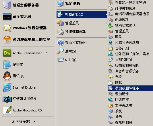 但是,大多数软件在这里是不能卸载的,我们可以点击“开始”-“控制面板”-“添加或删除程序”,如下图: