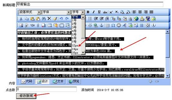 网站页面中的字体大小不协调 有时候,我们在后台发布文章或者添加产品时需要加上产品说明,但是,添加上这些文字后在前台您就会发现,这些刚才添加的内容字体偏大,与网站页面中的文字不协调,影响页面美观。下图中的左边产品类别与右边的内容明显感觉到不太协调。 解决的方法是,把所要调整字号的文字选中,点击上边的“字号”,在弹出的下拉列表中选择合适需要的字号,点击“修改”按钮,完成操作。