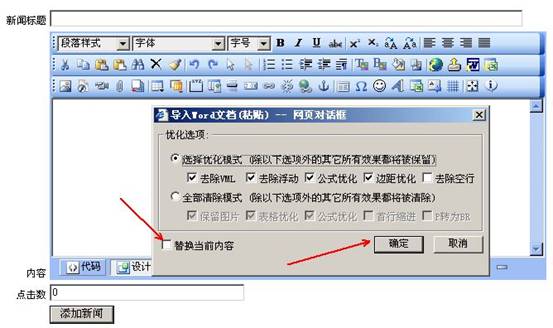 然后再起把内容粘贴到编辑器中,系统会弹出如上图的“导入word文档(粘贴)—网页对话框”直接点击确定就粘贴到编辑器中了。