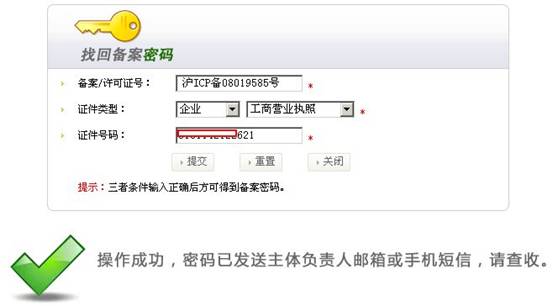 如何找回备案密码 网站备案通过以后,信产部会把备案号及密码都发送信息到网站管理者备案时填写资料中信息上(即网站管理者的联系方式)一般手机上要收到信息。但是,由于网站管理者当时没有在意,把网站备案的密码丢失了,如果该公司需要制作另一个网站或者公司的网站要重新选择网站空间后,那么这个新空间就需要备案,其实网站备案就是因为空间的问题才需要备案,这空间备案时需要原来网站备案的备案密码,这个密码是信产部给的,如果这个密码找不到了,要如何找回呢? 首先登录信产部的网站,网址为:http://www.miitbeian.gov.cn/state/outPortal/loginPortal.action;jsessionid=7KMdTycGJcY1J32P1JWyyRz17BmNkRYlW1sNDcRDVbk2NC2YWnxc!-1812705482 登录这个网站后在右下角的商品部位点击如下图所示的“找回备案密码”。 弹出如下图的“选择主体所在省”,然后点击下面的确定按钮,(说明:主体所在省即该营业执照第一个备案网站的所在空间,如:您的网站空间在上海,那么你就应在如下面的图中选择点击上海,如下图) 弹出“找回备案密码”对话框,在对话框中输入原备案号:如沪ICP备0801***号,证件类型选择“企业”后面一项选择“工商营业执照”再输入备案时所用证件号“营业执照注册号”点击提交。只要您提交的资料没有出错,系统会提示“操作成功,密码已发送主体负责人邮箱或手机短信,请查收。”如果输入的资料不对,就会提示没有找到该信息,或者提示信息有错。