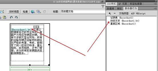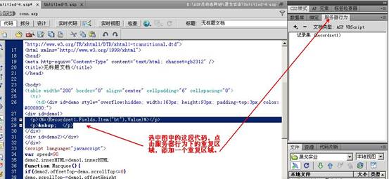 在记录集中把“bt”拖放到如下图的滚动框中,选中记录集字幕,在服务器行为下设置“重复区域”。设置“重复区域”要测试显示的标题数是否相符。其中的代码也有可能要进行修改。
