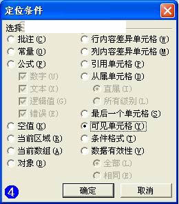 5、选中筛选后的数据区域,执行“编辑定位”命令,打开“定位”对话框,按其中的“定位条件”按钮,打开“定位条件”对话框(如图4),选中其中的“可见单元格”选项,确定返回。
