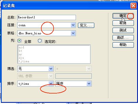 在DW软件中新建一个文档,类型为ASP VBS,保存为news.asp,点击“窗口”打开“服务器面板”在“绑定”面板中的“+”号下拉箭头点击“插入记录集”设置如下图: