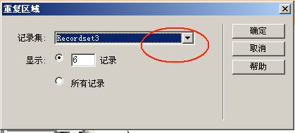 选中新闻列表下面的一行(bt tjtime),尤其注意一定要在选中这行后,在属性页面上面必须是选中一个带<tr>的标记。在服务器面板下拉箭头中点击“重复区域”,在弹出的对话框中一定要注意选择所在的“记录集”,根据需要设置所显示的新闻数量。点击“确定”按钮。