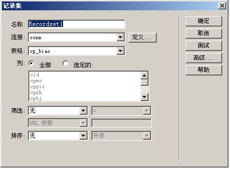 一、新建一页面,保存为cp_xsdt.asp(如果该站点中有相同的页面,即可在后面加上数字如cp_2xsdt.asp),在“绑定”面板“+”号下拉中选择“记录集(查询)”,进行如下设置: