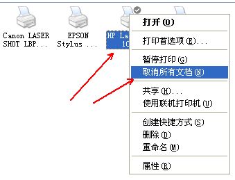 将鼠标定位在默认的打印机图标上右击,弹出如下图所示的对话框,点击【取消所有文档】,