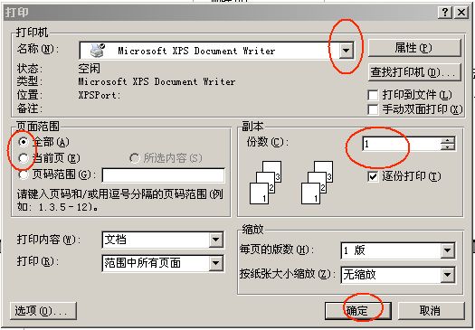 然后再点击【文件】,【打印】,弹出【打印】对话框,在对话框中进行如下图所示。如果该文件有多页,我们只打印其中的一页或几页,可以在页面范围下选择,上边的下拉箭头下可选择打印机的型号,份数后面可选择打印的份数。点击【确定按钮,完成打印。】