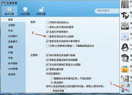 在上图中的“基本设置”下点击“登录”弹出如右边所示的设置面板,按红色箭头所示,把“登录后自动运行QQ宠物”前面方框中的∨去掉,然后点击框中右上角的×就好了,下次您登陆QQ时再也不会自动弹出QQ宠物了,但是,如果朋友送您的这个QQ宠物在您的电脑重新安装系统再安装QQ后,要按照上述的方法重新设置。