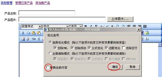 在网站后台添加新闻或添加图片内容时,弹出如下的对话框,在有的电脑中由于安装系统时没有安装好必要的插件或在ie浏览器的工具选项下没有设置,会弹出一个对话框,要求您安装某个插件,这时您必须要在线安装或下载安装,否则您是不能复制内容到如下的对话框中。安装好后再复制内容到要添加文件的框中,下弹出一个如下的小对话框,您可以点击前面的“替换当前内容”,或直接点击“确定”,就可以粘贴到框中了。