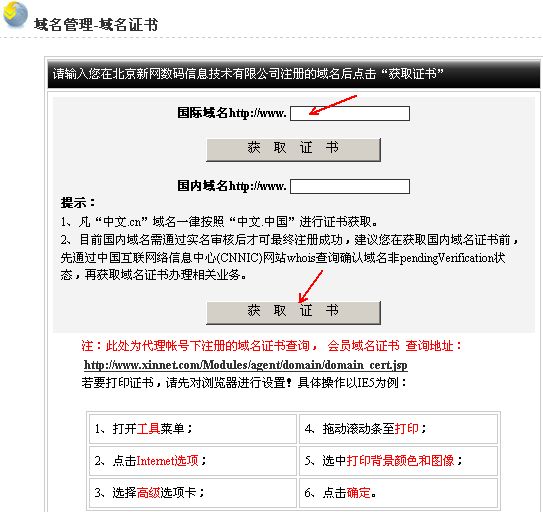 现在对网站备案的要求都比较严,除了要求公司的营业执照复印件及组织机构代码证正本复印件等加盖公司公司公章、法人身份证扫描件外,还需要域名证书,但是现在在新网注册的域名比较多,因为他便宜,所以在新网注册的域名比较多,但是新网有很多的页面(代理商需要进行操作的)都是隐藏的,如果您想要在新网的网站里面找的话,就是把整个网站翻过来,也许很难找到您要的页面,因为它有很多页面是隐藏连接的,现在把在新网如何下载域名证书,把这个网址复制到“ie”地址栏“回车”,http://dcp.xinnet.com/Modules/agent/domain/domain_cert.jsp登录这个后,输入域名即可。点击“获取证书”,就可以查看域名证书了,但是新网的服务器不怎么好,除了别人买他们的空间网站比较慢,就连新网自己的网站也很慢,如果域名证书上面的图片不显示时,您可以刷新一下,或稍等会后就可以看到整个域名证书了。