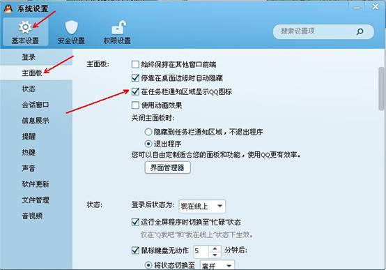 点击如上图红色箭头中的图标“打开系统设置”,弹出“系统设置”对话框,点击菜单中的“主面板”,然后在右边把“停靠在桌面边缘时自动隐藏”、“在任务栏通知区域显示QQ图标”,然后点击右上角的×,关闭对话框。这样QQ图标就显示在桌面的右下角了。