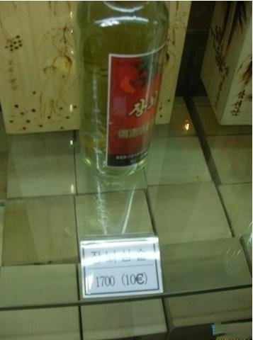 要了解朝鲜人民的收入,首先要了解朝币的比价。看看这个专为外国人设的商店里卖的酒,就知道朝币与人民币的比值了。我们知道100人民币=10欧元,图片中这瓶标价10欧元的酒应该折合100元人民币,而那个1700,就是朝币的价钱。即:100元人民币=1700朝币。