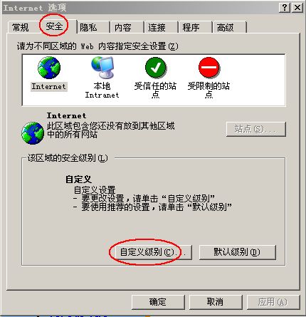 点击“Intermet选项”,在弹出的对话框中点击“安全”、“自定义级别”。