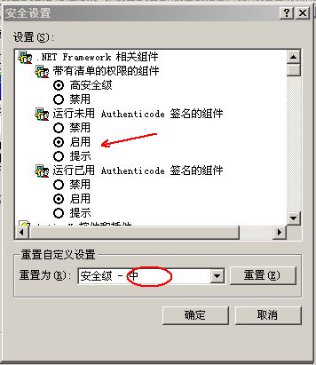 说明:部份电脑系统的“安全设置”对话框有的“组件”提示“启用”后会有危险的除外,其它都设为启用。设置好的后在“重置为”-“安全级”的下拉箭头中选择“中”,点击“确定”按钮。完成设置。如下图所示:进行了下图中的设置后,一般的功能操作都能显示了。