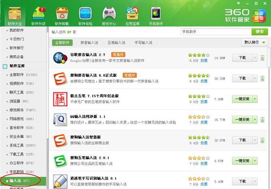 弹出如下图,在下图中点击左边的“输入法”,右边就会显示出系列输入法软件,我们可以在其中选择任意一款自己会用的输入法软件,再点击右边的“下载”或“一键安装”,如果是下载,下载了后还要安装,才能使用,如果右边是“一键安装”,点击后就会自动下载并安装好了,只有这样,你的电脑里就有了输入法了。