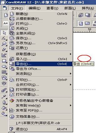 以下面这张图片为例,我们在CoreIDRAW中制作了一张名片,要想把它保存为jpg图片。点击CoreIDRAW “菜单”中的“文件”,在下拉列表中点击“导出”,或按快捷键“Ctrl+E”弹出下拉列表,如下图所示: