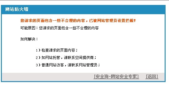 如果您的网站突然之间被安全狗锁定,导致整个网站或部份页面不能正常浏览,您会感到大为恼火,认为是谁黑了您的网站,其实这不是有人故意设置的,一般来说,网站的服务器设置了安全狗,防止一般的欺诈代码侵入或者小的程序木马侵入。但是也是因为您的网站浏览的人数突然增多起来,也会引起“网站安全狗”的 ,所以当您浏览这个被安全狗锁定的网站时就会弹出一个对话框如下图: