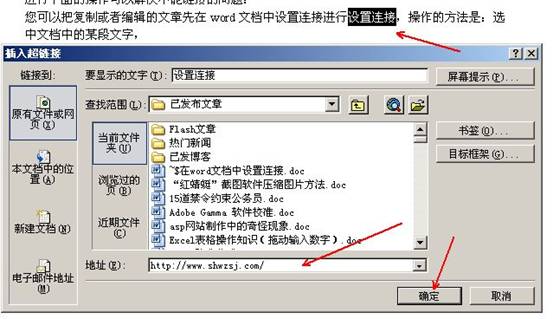 您可以把复制或者编辑的文章先在word文档中设置连接进行设置连接,操作的方法是:选中文档中的某段文字,按键盘上的Ctrl+k“插入超链接”,在下边的地址后的文本框中输入需要链接的网址如http://www.shhp.net点击“确定”按钮,完成word中的超链接操作,如下图所示:
