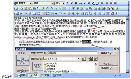 再登录网站后台管理,把编辑好的word文档复制到编辑器中,从下图中可以看出,在word文档设置的超链接文字,仍然是带有链接的文字,点击插入记录,完成链接设置。如下图。