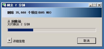 你可能会说从U盘中把一个文件拷贝到本地电脑中本来就慢些,但也不至于慢到这种程度。那么win7系统删除文件又有多快呢?请看下面的截图:从下图中可以看出,一个685MB的文件在本地电脑中删除下也要2分多钟,这可见识到了吧,你可能没有注意这些,但是对于一个经常操作电脑的人来说,时间就是金钱,如果你不在乎时间的话,那就不要说了。也许你还会说,是你的电脑配置太低,所以运行速度慢,可我操作的这台电脑是4G内存,双核5300的CPU,应该不会这么慢的,以前使用xp系统时很快的。可安装了win7系统后,就成了老牛拉车了。