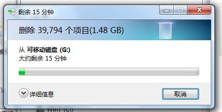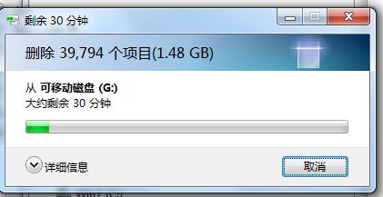 另外从U盘删除一个1.48G的文件显示需要时间为30分钟。(见下图二、三)U盘为正宗金士顿8G,