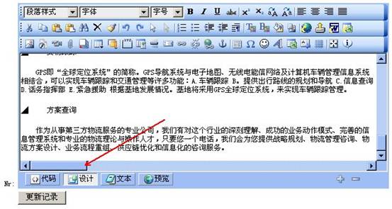 解决方法:选中全部文档,点击上图中红色箭头边的文本,点击文本后编辑器没有了编辑图标,然后再点击设计返回到编辑器框中,继续编辑即可。