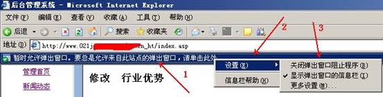 我们在后台添加文章或其它内容时,有时会遇到浏览器会阻止你进行此操作,比如会弹出如下图片所示的“暂时允许弹出窗口,要问题允许来自此站点的弹出窗口,请单击此处。”
