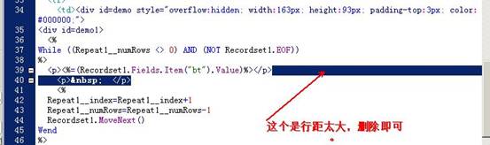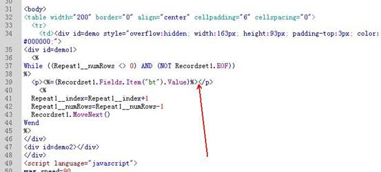 在记录集中把“bt”拖放到如下图的滚动框中,选中记录集字幕,在服务器行为下设置“重复区域”。设置“重复区域”要测试显示的标题数是否相符。其中的代码也有可能要进行修改。