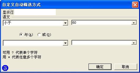3、此时,系统弹出“自定义自动筛选方式”对话框(如图3),单击左边方框中的下拉按钮,在随后弹出的下拉列表中,选择“小于”选项,然后在后面的方框中输入数值60(参见图3,此处,假定小于60分为不及格),确定返回。